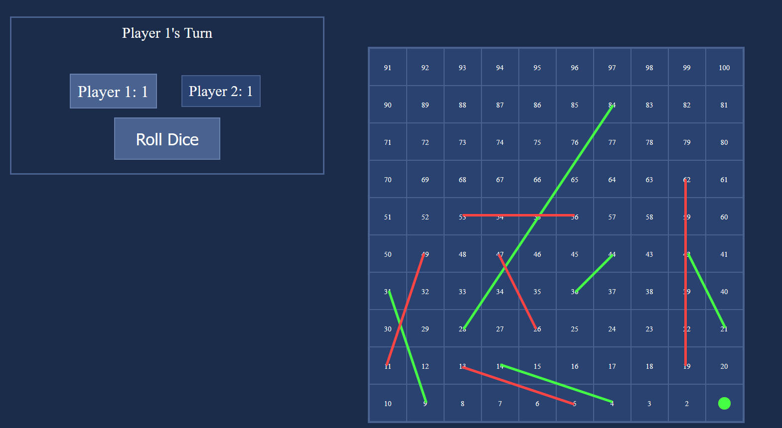 Snakes and Ladders is a simple board game. Players take turns rolling a dice and move their piece forward according to the number rolled. If they land on a ladder, they climb up to a higher position on the board. If they land on a snake, they slide down to a lower position. The first player to reach the final square wins the game.