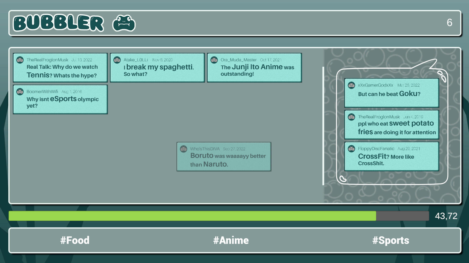 Bubbler is a drag and drop style game where you need to combine tweets to a social media bubble and feed that bubble with the right hashtags. At the same time, you have a timer that counts down. By assigning the right hashtags to your bubble, you gain a few seconds of extra time to keep playing, if you assign the wrong one, you lose time.You will need to skim the text and look for similarities amongst the hot takes and unpopular opinions. New posts and hashtags will keep appearing until you have no more time left and the game is over.
