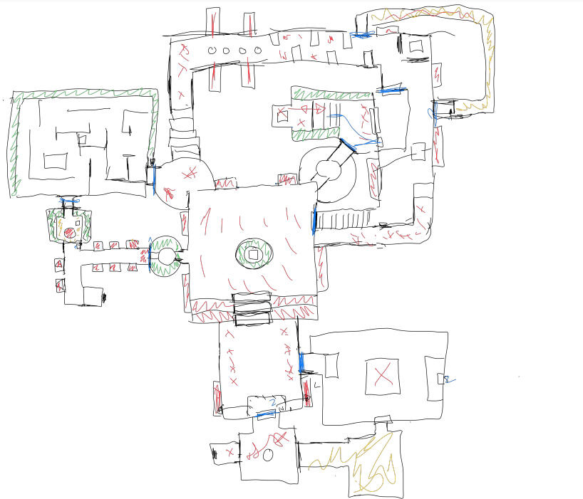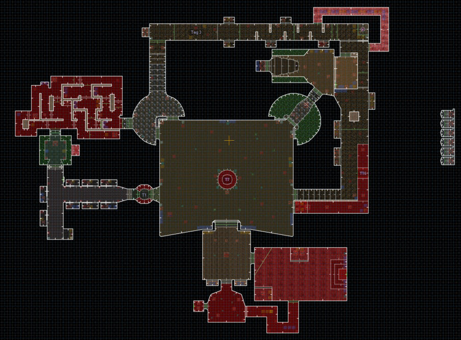 The assignment also includes the keyword "siege". Among other things, "siege" stands for the conquest of a fortified complex. My association with this was the conquest of classic medieval castles. Here I first looked at floor plans of castles. I was particularly struck by the corner towers and set myself the goal of incorporating such towers in some form into my level. I then looked at the existing textures in the Doom Builder to see whether it would even be possible to create a castle-like building. I also noted down specific areas that could be implemented in Doom. For example, a prison/catacombs in the form of a labyrinth or a castle courtyard. It quickly became clear that I would implement a castle-like structure in my level.