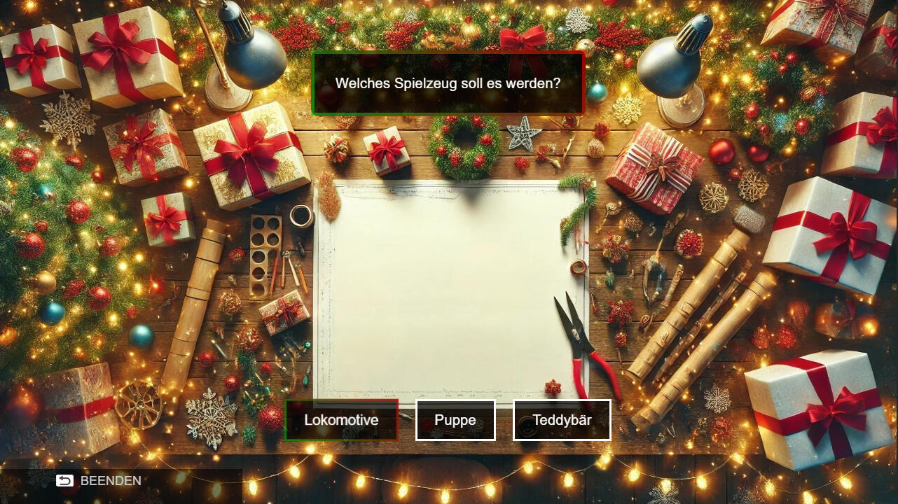 Elf on Duty is a small visual novel in which the player takes on the role of a Christmas elf on the day before Christmas. The player has to solve small puzzles and make decisions, which can lead to different endings. There are six endings in total.