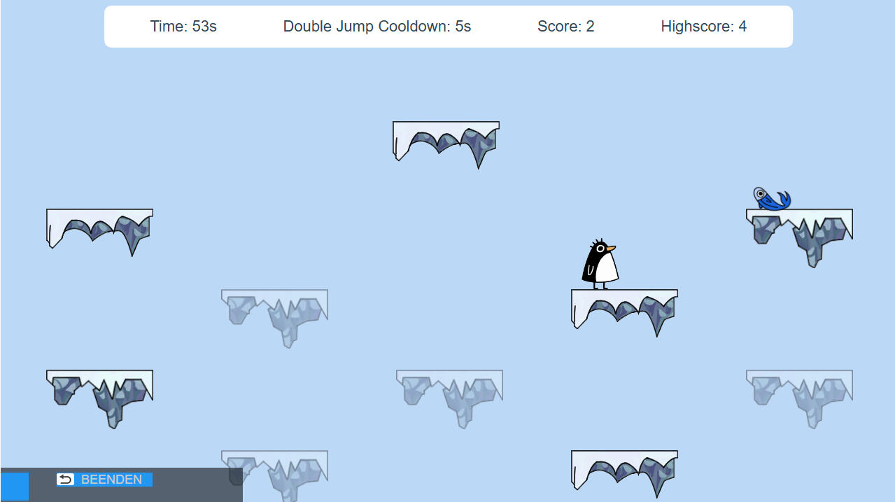 Limited Platforms is a 2D platformer in which the player (penguin) has to collect as many fish as possible within 60 seconds, with some platforms being disabled for a few seconds every few seconds (and the penguin falls through them). The game is over as soon as the penguin falls into the abyss, jumps into a seagull or if the game timer runs out.